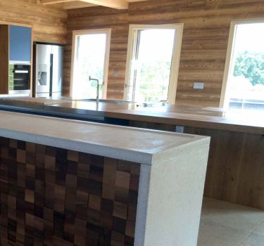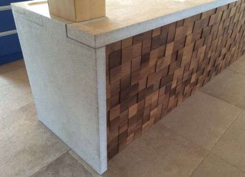 Un ilôt avec plan de travail en pierre et parement bois 3D noyer